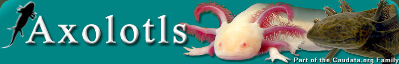 ConclusionAxolotls come in many different colour variations. Axolotl breeders often produce an odd offspring whose phenotype defies what the breeder knows to be its genotype. Piebald axolotls (not just on the top of the body like a leucistic), yellow leucistics with black spots, and the harlequin (orange and black patches on a white axolotl) are just a few examples of what chance can present. You can see the huge variety of axolotl colour variations in Caudata.org's User Photo Gallery. Keep your eyes open for unusually coloured axolotls that don't match the descriptions here. They might be very special indeed. Unless cited in the Acknowledgements, all text and images are ©1998-2019 John P. Clare. All Rights Reserved. Bookmark Axolotl.org with: